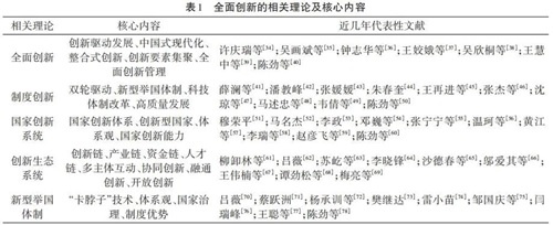 表1總結了制度創新、國家創新系統、創新生態系統和新型舉國體制等與全面創新相關的重要理論及其核心內容。